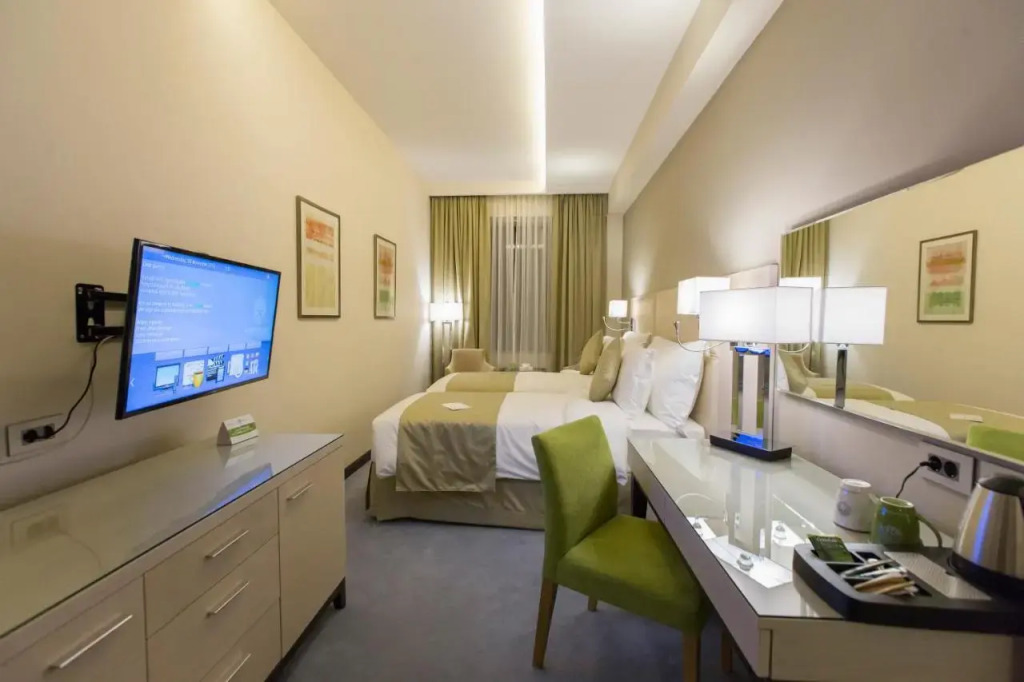 Spend an evening in a nice atmosphere of the bar. You can stop by the restaurant. Have a cup of coffee in the cafe and, who knows, maybe it’s going to be the best one in the city. Free Wi-Fi on the territory will help you to stay on-line..If you travel by car, you can park in a parking zone. The following services are also available for the guests: a massage room, a sauna, a steam bath, a spa center and a hamam. Sports fans are going to love a fitness center and a gym. You will find these entertainment amenities on the premises: a karaoke, a picnic area and a barbeque area..Here, you can treat yourself with water procedures as there will be a pool and an indoor pool. Children will be happy, there is a playroom for them. Want to have an excursion? Consult the tour assistance desk of the resort. For the free movement around the city, the resort offers a transfer for you..Accessible for guests with disabilities: the elevator helps them to go to the highest floors. At the guests’ disposal, there’s also a laundry, dry cleaning, an ATM, private check-in and check-out, press and a concierge.