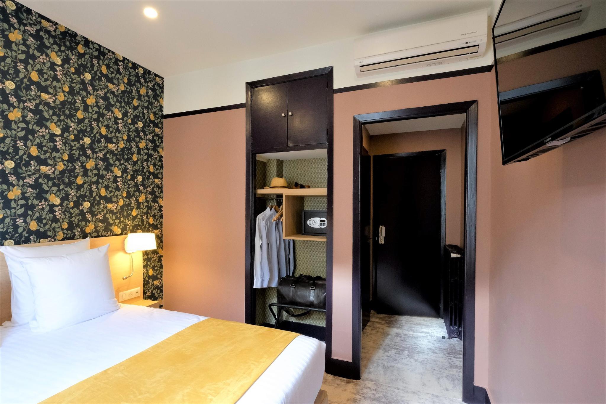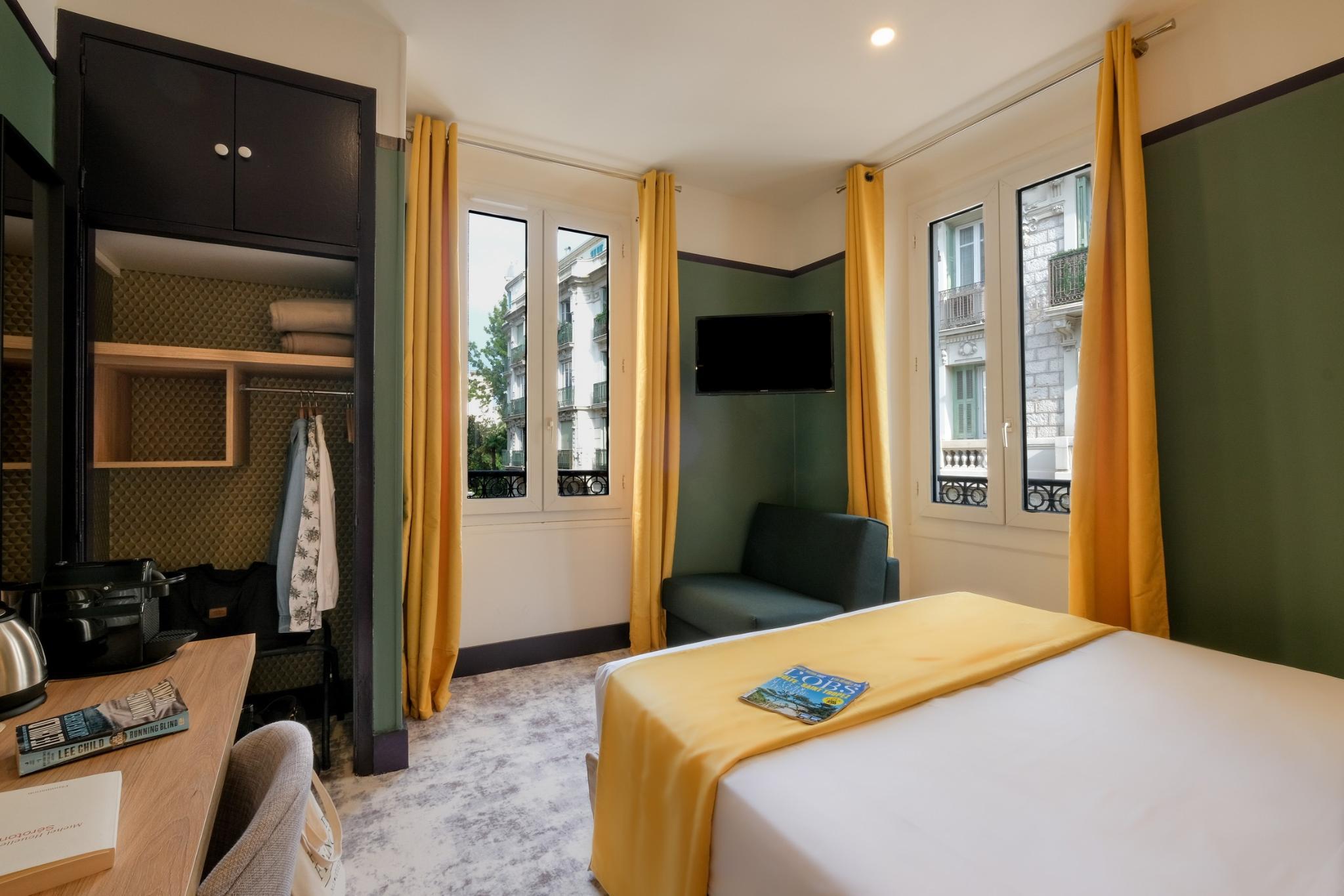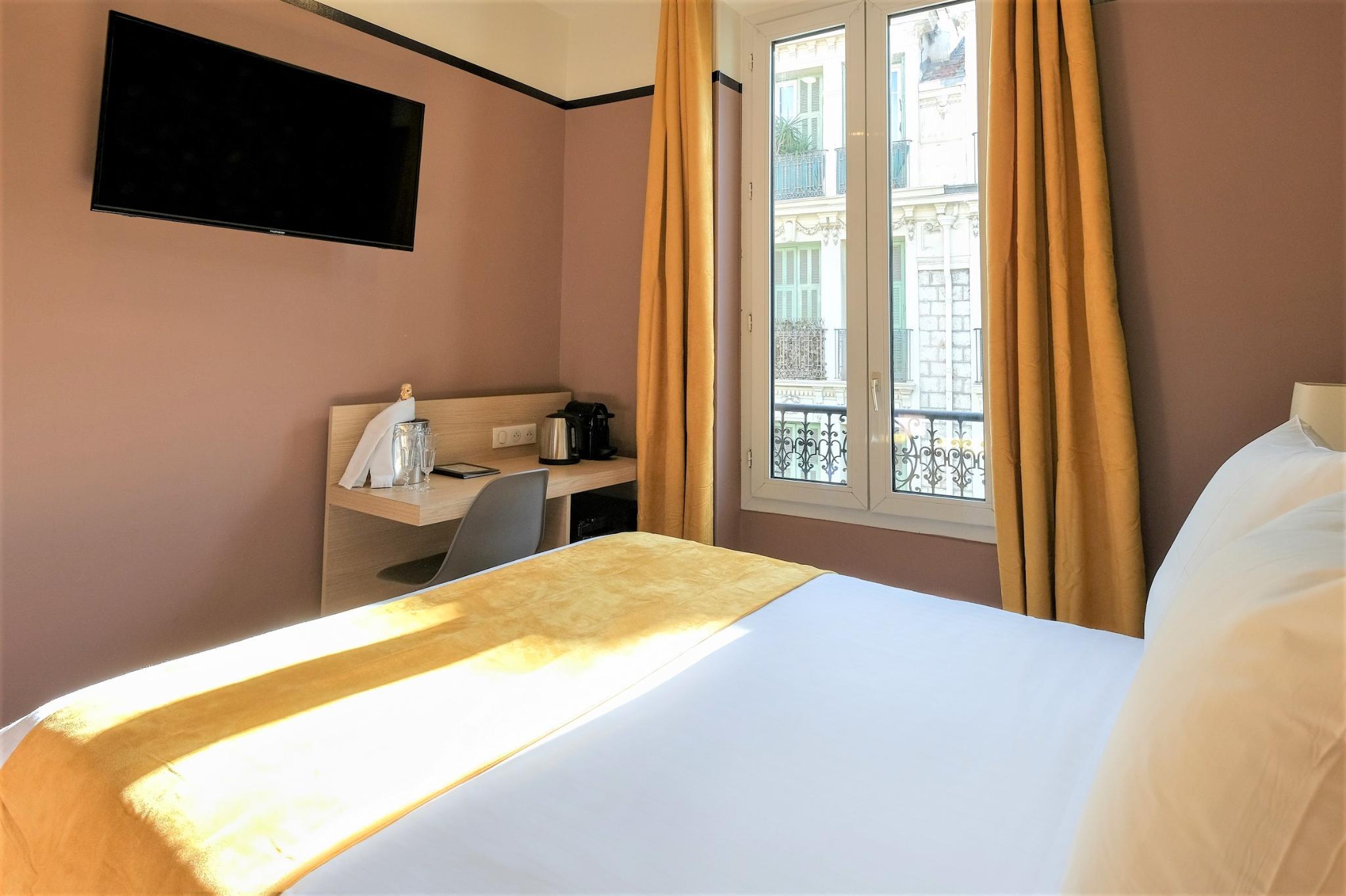 This particularly charming hotel is located in the heart of Nice. It lies around 50 m from the sea and close to the pedestrian area with major shopping and entertaining venues. The airport is just 8 km from the establishment. The hotel complex offers 27 soundproof rooms in a familiar atmosphere. Facilities on offer include a 24-hour reception, a TV room and a breakfast room. A continental breakfast is served for guests in the breakfast room. There is also a free wireless access in the lobby of this establishment. All accommodation units are fully-equipped as standard featuring air conditioning and an en suite bathroom with a shower. Further room amenities include a hairdryer, a TV and a direct dial telephone.