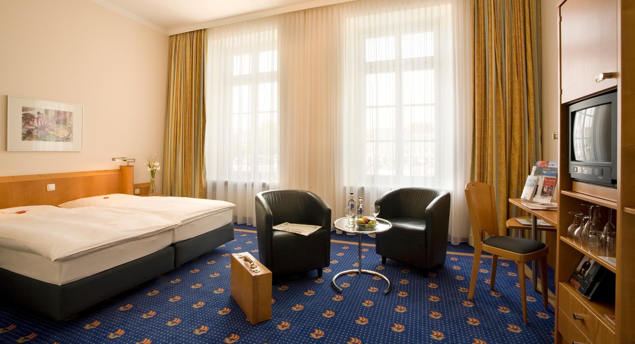Right along the beautiful market place of the old Hanseatic city of Wismar, this hotel offers picturesque views of a living past and seamlessly combines tradition with progress. Behind the historical facade, guests will find the rooms furnished in a modern and comfortable style. The city centre, which begins right outside the door, is a UNESCO World Heritage site, well worth a thorough exploration. Other local points of interest include the harbour and the Church of St. Nicholas. The state-of-the-art conference rooms will host any event, whether guests need a place for a seminar, a conference or a wedding celebration.