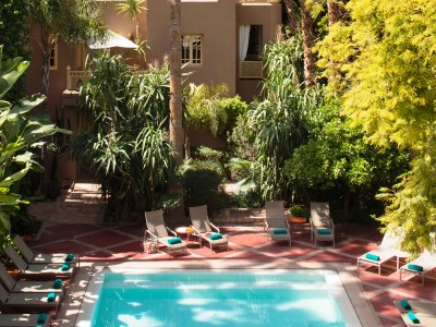 This 5 star hotel is located in the city centre of Marrakech and was established in 2001. It is a short drive away from the Saadian Tombs and the nearest station is Marrakech. The Hotel has an outdoor swimming pool and a fitness centre/gym. All 36 rooms are equipped with minibar, hairdryer, safe, trouser press, ironing set and air conditioning.