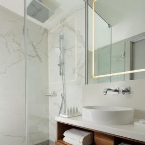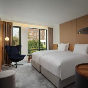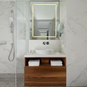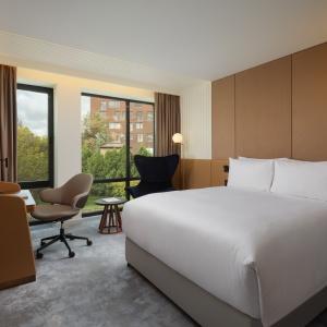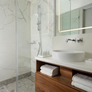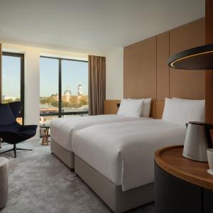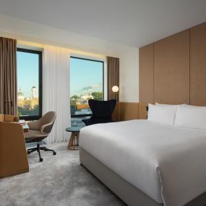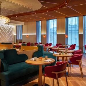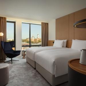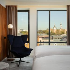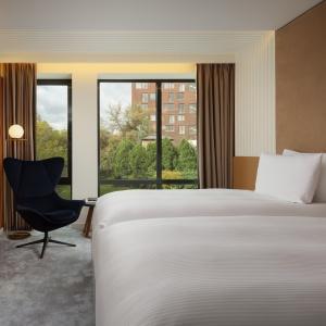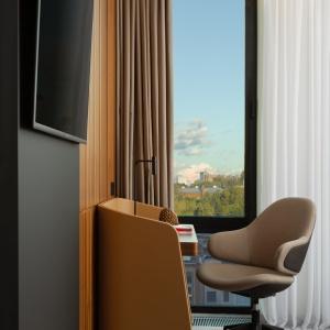 The hotel offers 154 spacious and comfortable rooms of various categories. Among them there are 12 connecting rooms. Each of them has panoramic windows overlooking the cultural and business center of the city. Each room has Wi-Fi, TV, telephone, air conditioning, safe, mini-fridge, kettle, bathroom with heated floors, shower (some rooms also have a bath), hairdryer, bathrobes and slippers.