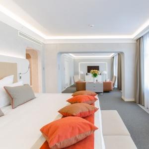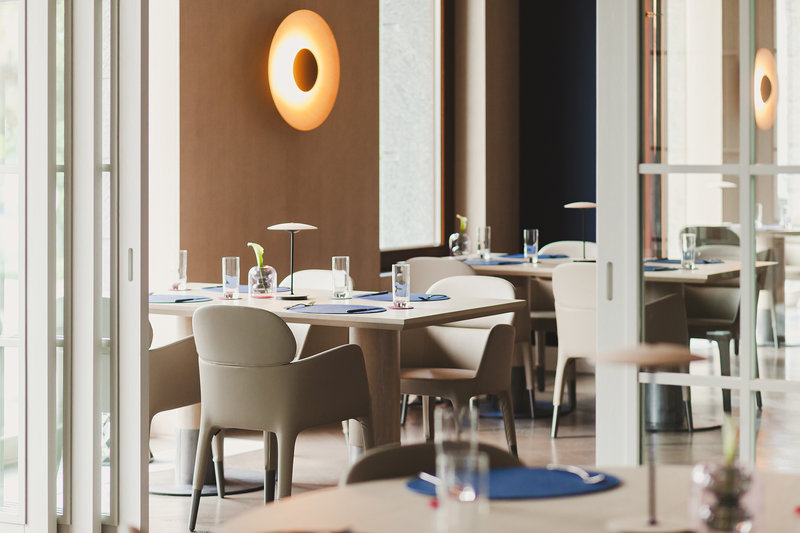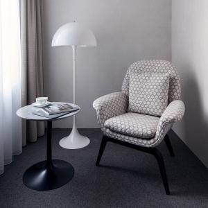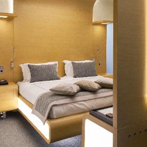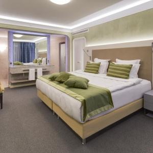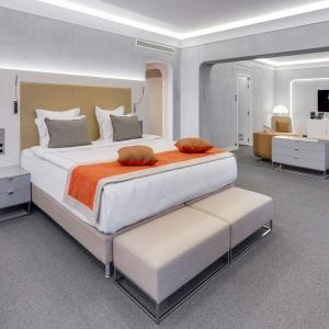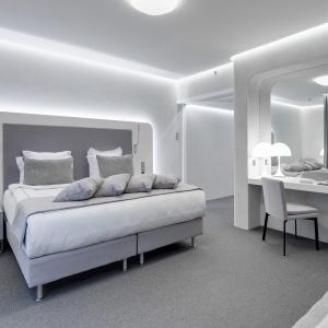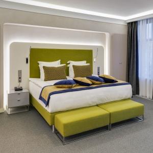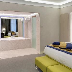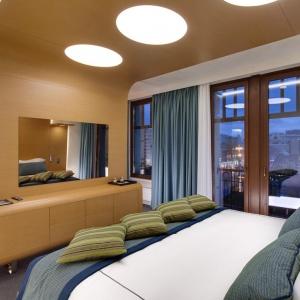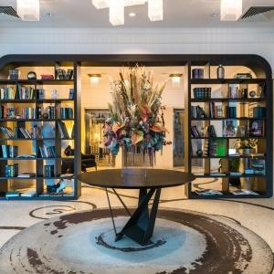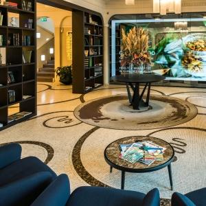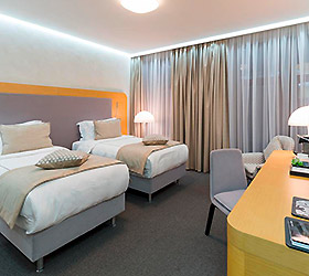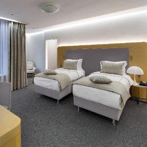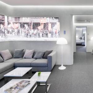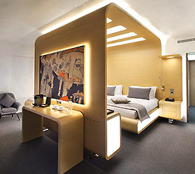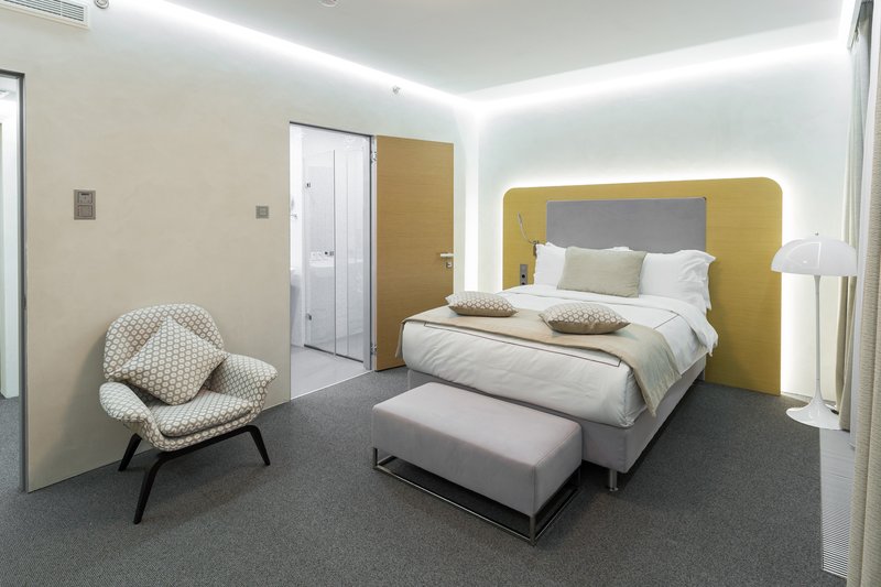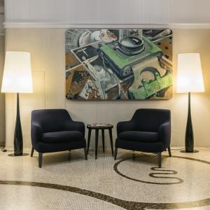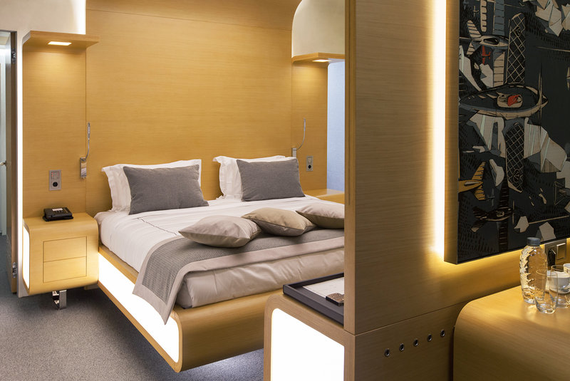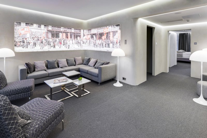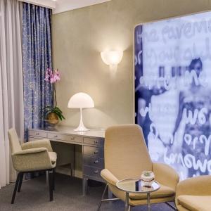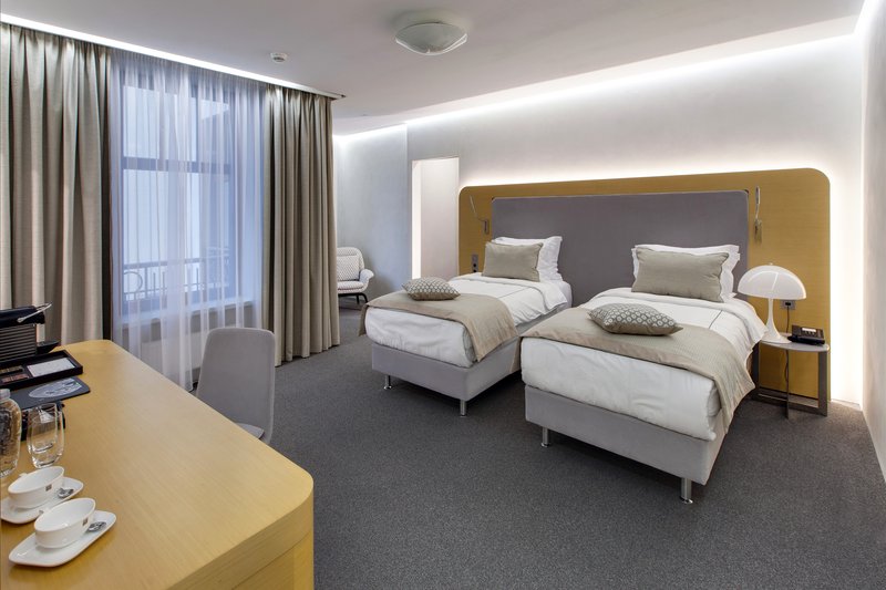 The hotel interiors are in the style of retro-futurism of the 1950s. The hotel offers 105 rooms of different categories. For guests' convenience, each room is equipped with a collection of bed and bath accessories, HD satellite TVs, high-speed Wi-Fi, individual air conditioning, safe, work desk, telephone, reading lamps, hairdryer and minibar. Hand-painted panels and plots on the walls in monochrome sgraffito technique complement the original design of the space.