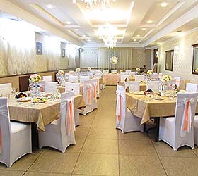 Every morning hotel guests are welcome for breakfast buffet at the restaurant. During the day guests can order food and drinks from the restaurant via room-service. The banquette hall with 90 seats is suited for hosting banquettes, weddings, anniversaries, standing receptions and corporate parties. Smaller groups can be comfortably seated in a separate hall for 20 people.