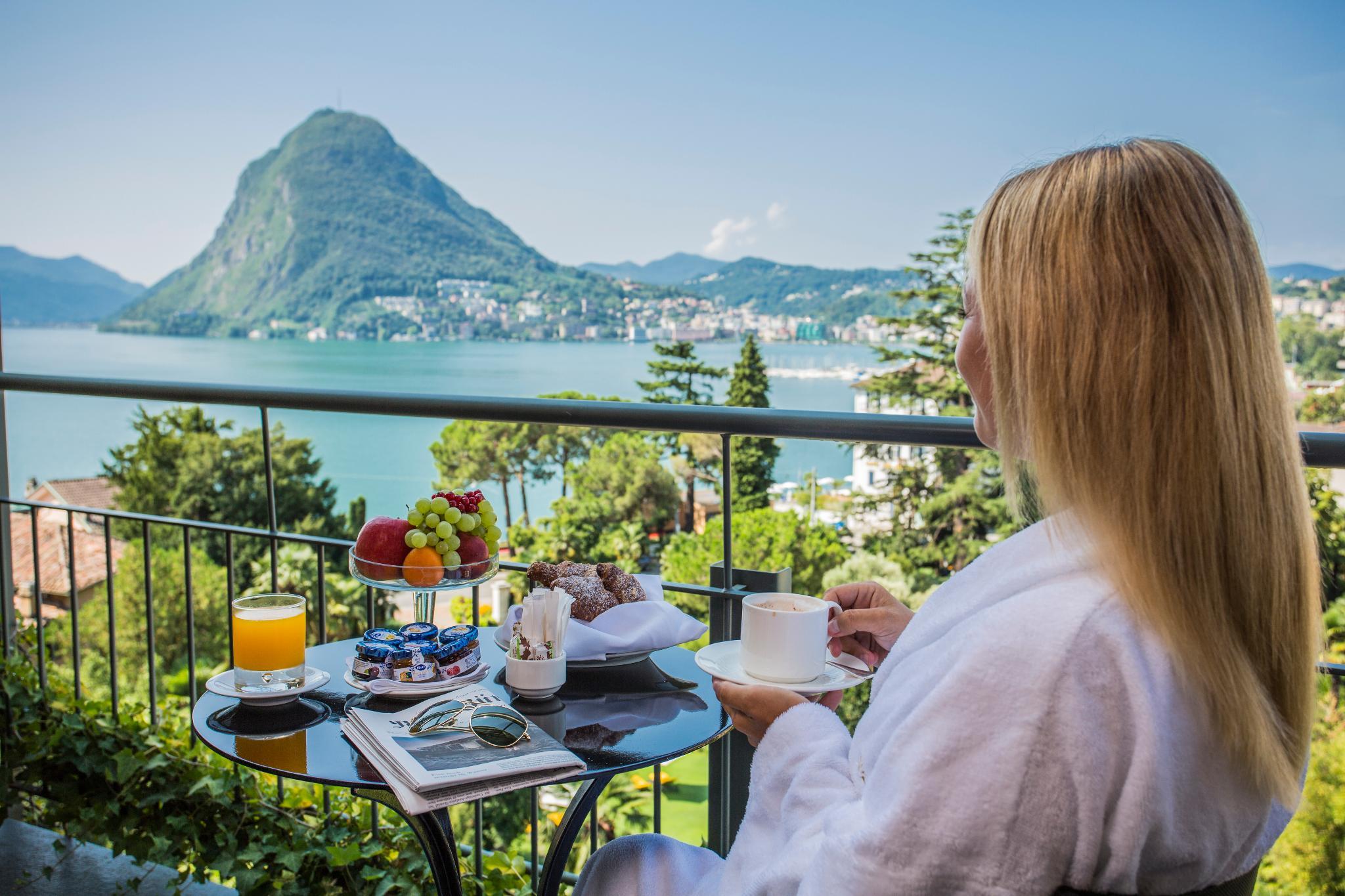 This beautifully decorated Hotel is located in Lugano and enjoys a privileged position inside a large sub-tropical park, with a beautiful view towards the lake. The elegant villa, built in 1880, combines the charm of a bygone era with the comfort and the care of a modern luxury hotel. The complex, originally built for the Von Ritter, a noble Russian family, was bought, in 1885, by a young Swiss couple of the Schnyder von Wartensee family. They transformed it into a hotel and the family owned it up to 1982, when it was sold to a local family. A total redecoration was then started by the new owners to return the building to its original beauty and provide the highest standards of comfort. The menu stands out for sweetwater and sea food specialties, light and innovative Mediterranean cuisine in cosy and informal settings. There are conference and meetings rooms. A wellness area with indoor pool and gym. Every detail is taken care of, to make guests feel welcomed into this "private home". The hotel offers rooms, of exceptional charm, individually styled, with stunning park and/or lake views, balcony, terrace or loggia.