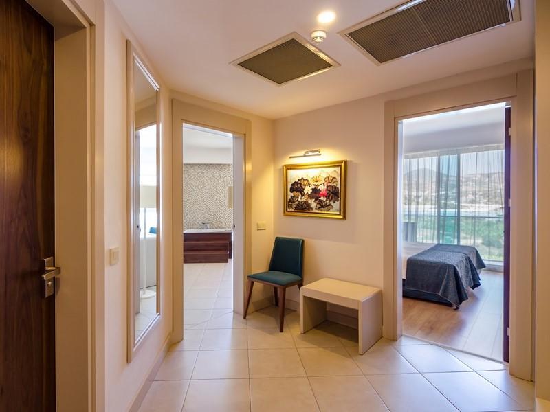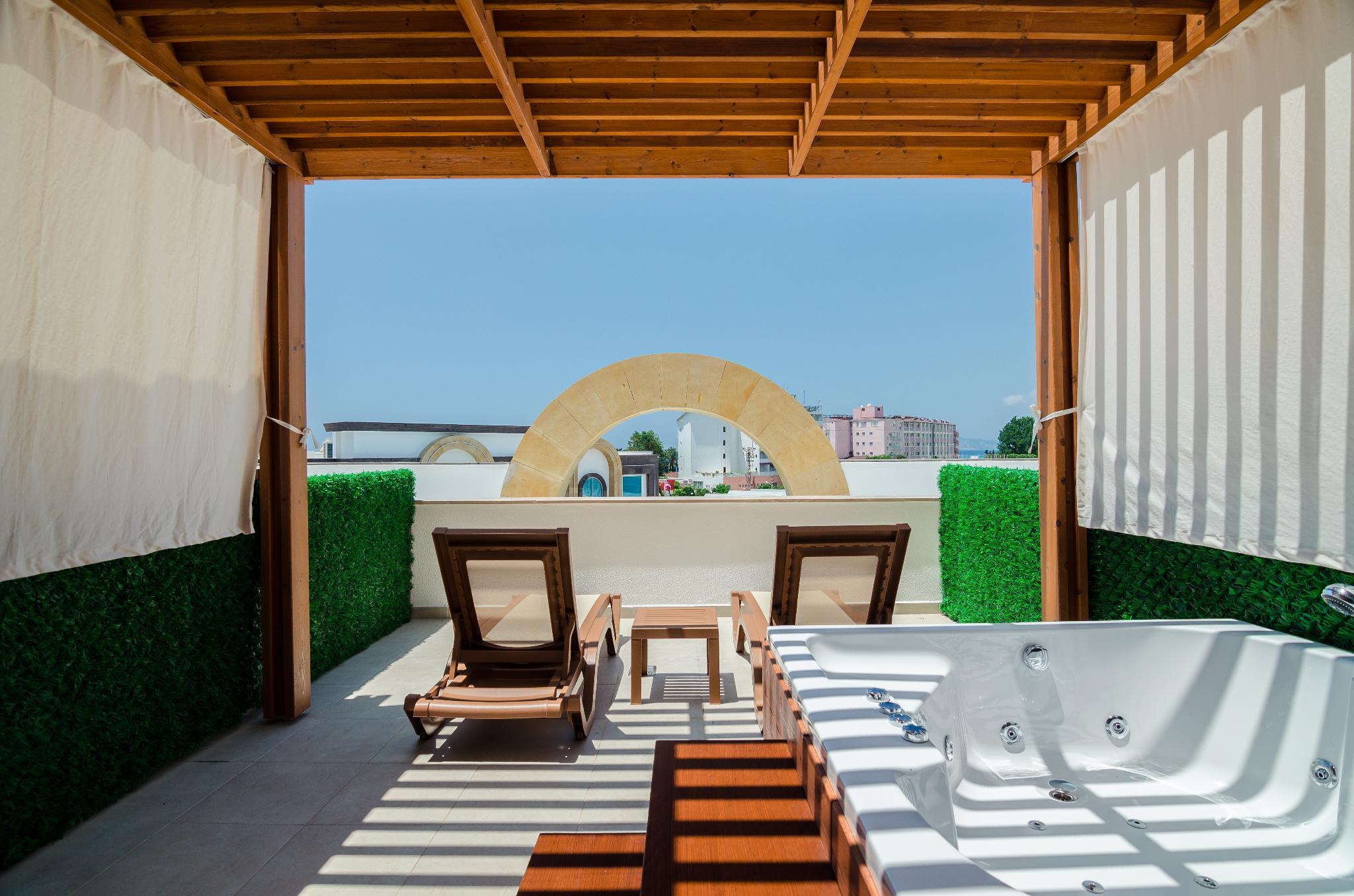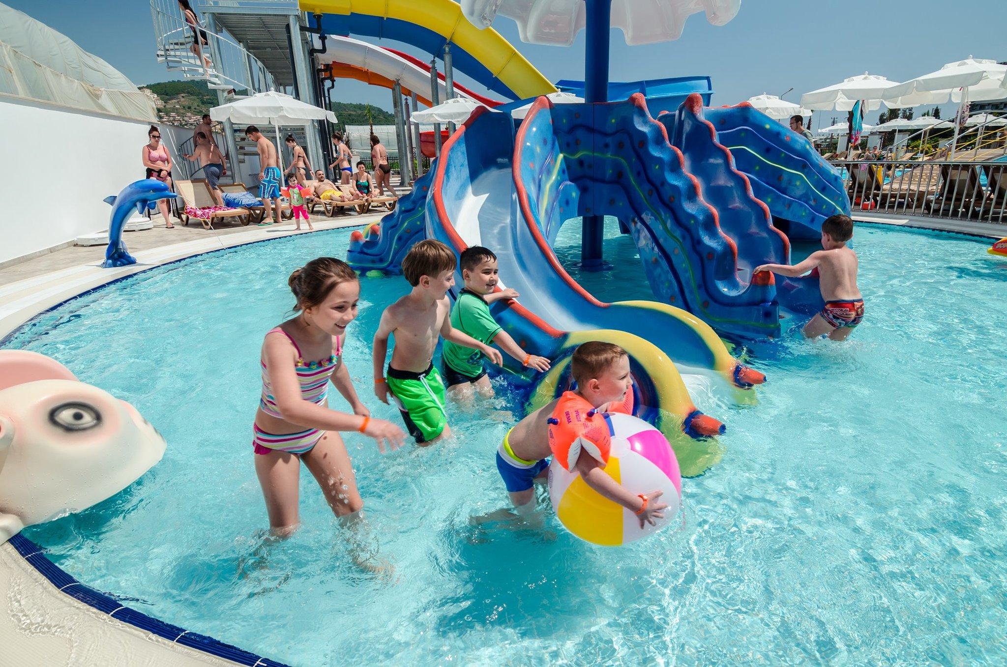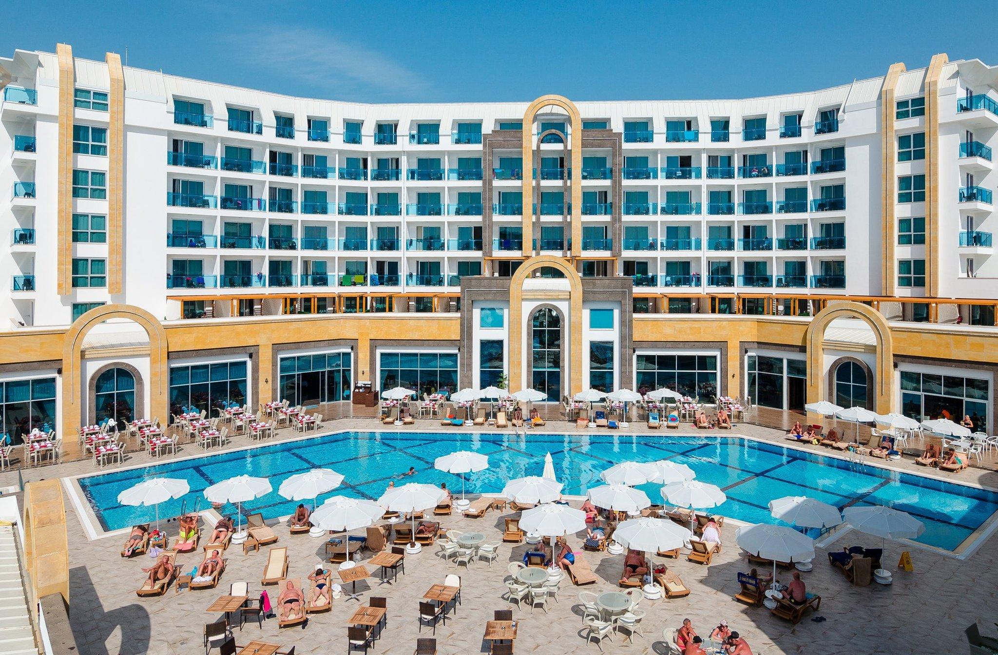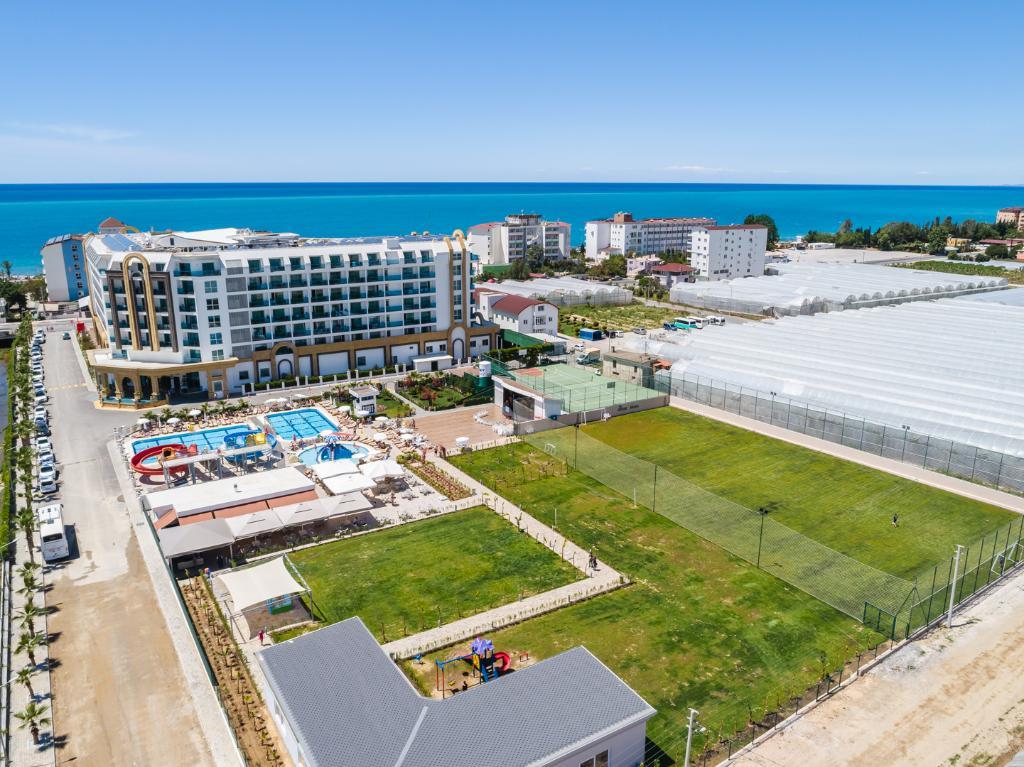 This resort hotel is located on an area of 18.000 m and opened in May 2016. It is at a distance of 3 km to Mahmutlar city centrum, 15 km to Alanya city centrum, 155 km to Antalya International Airport. Total pool area of, 1.375 m pools and scenic beauties surrounded by banana trees which make guests to live comfort and rest as at their homes. Each air-conditioned room is fitted with convenient amenities including LED TV, coffee&tea facilities, minibar, safe box and a private bathroom with hair dryer and toiletries. The hotel gives the sense of a different holiday to all guests with fascinating architectural design. The miniclub which is consisted of playground and swimming pools with slides, provide a comfortable holiday for the families with children. In relaxing and comfort atmosphere of the spa and wellness center, guests can refresh the body and mind by special therapies and be purified from all stress and negative energy of the body.