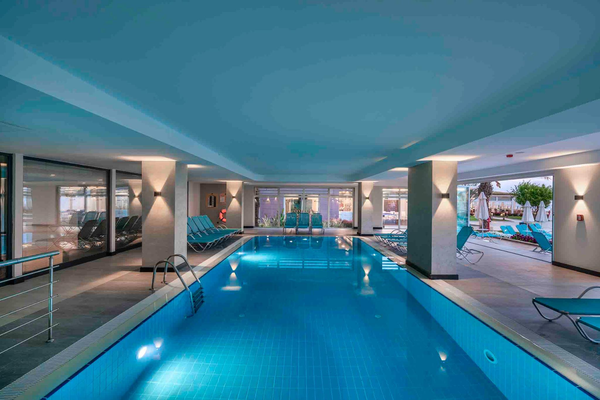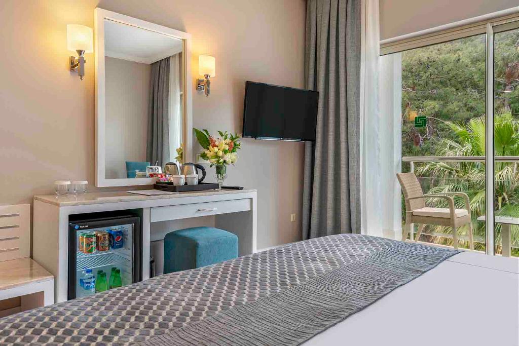 Nestling within metres of the turquoise waters of the Mediterranean and with a pine forest backdrop, this family friendly spa hotel offers a great place to stay with many facilities available. The hotel has a 24 hour reception service. Laundry and room services are available and there is also free Wi-Fi access in the lobby. The rooms are decorated and furnished in light, fresh colours and have either carpeted or tiled flooring. In room amenities include air-conditioning, safe box and satellite TV, as well as a mini bar. The hotel offers a range of recreational facilities from the spa and wellness centre, outdoor pools and beach water sports to entertainment provided by the animation team.