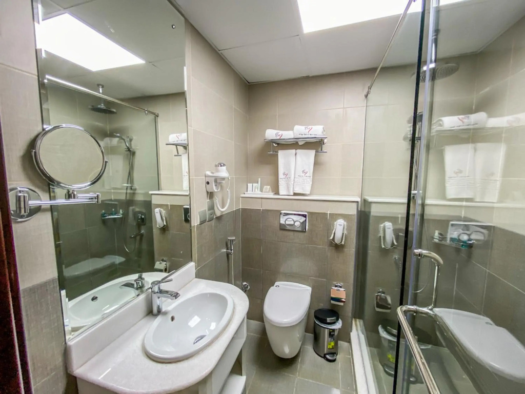 Here’s what you’ll find in the room to have a rest after a long day: an alarm clock, a shower, a TV and a mini-bar. The room equipment depends on its category.