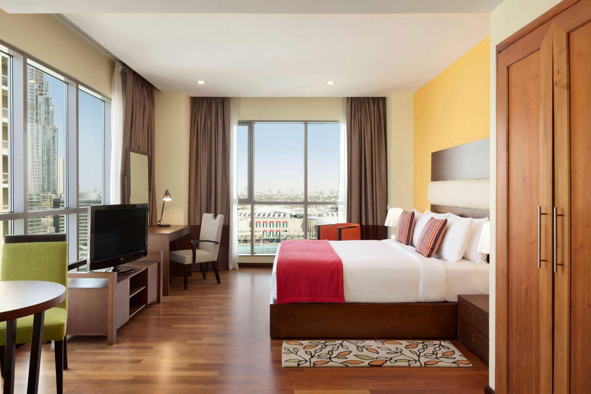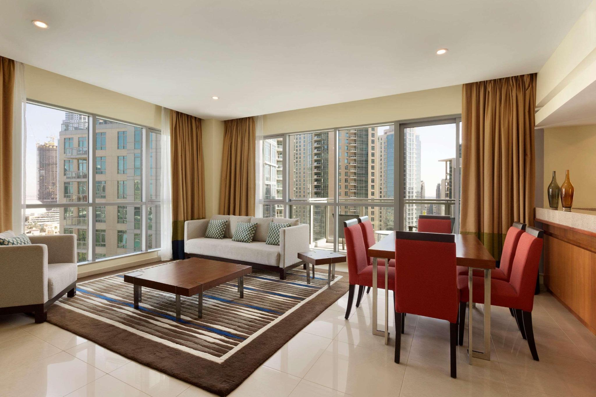 The Ramada Downtown Dubai is located within one of Dubais most vibrant locations -downtown Burj Khalifa- a walking distance to Burj Khalifa and Dubai mall. The hotel is within a short drive to Dubai business districts such as Dubai World Trade Centre, Dubai International Financial Centre, Dubai Healthcare City and Dubai Internet City. We offer a unique and exciting experience of inner city suite living combined with all the facilities and services of first class hotel suites. Our guests can enjoy a true -Home Away From Home- experience. All our suites are furnished to a high standard including 30 junior suites, 120 one-bedroom suites, 30 two-bedroom suites and 1 penthouse. We have interconnecting units to make 3 and 4 bedroom suites for large families. We provide free Wi-Fi internet connection in the hotel public area as well as 1 free access for each suite, and for any additional access extra charges are applicable.