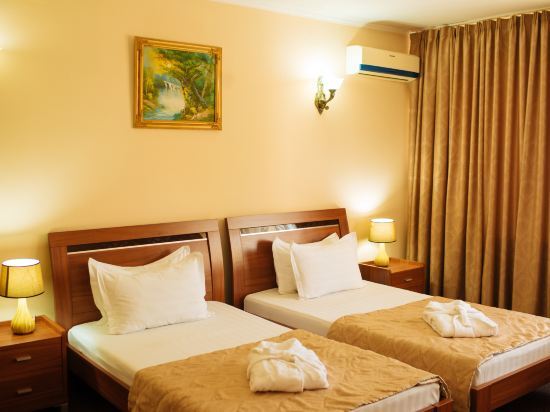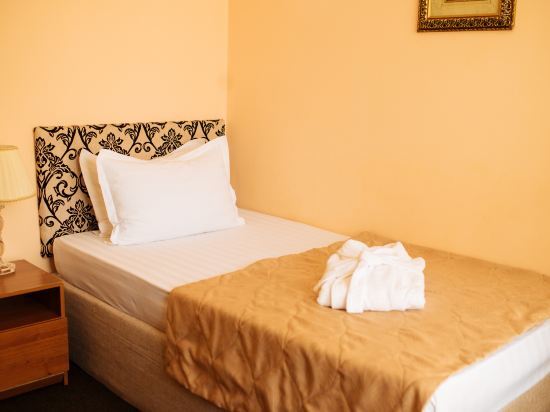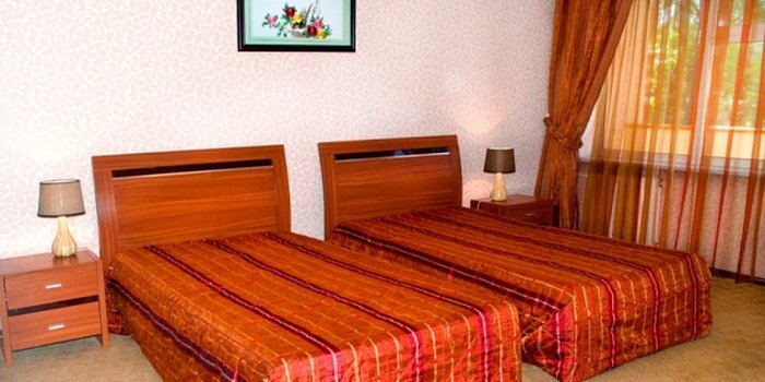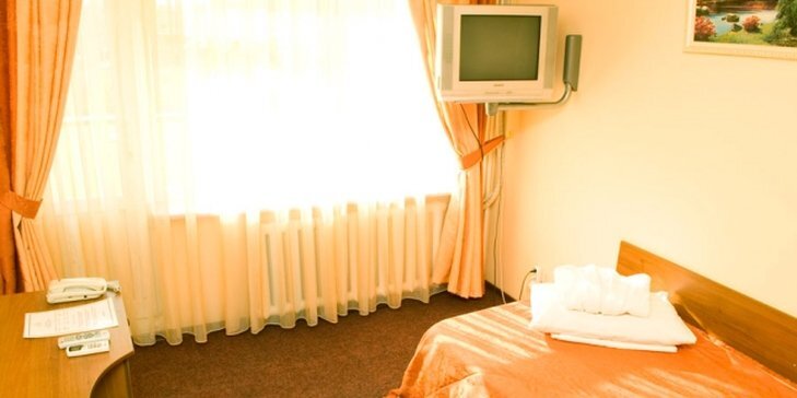 In the room, there is an alarm clock, a TV, a bathrobe and slippers. The room equipment depends on its category.