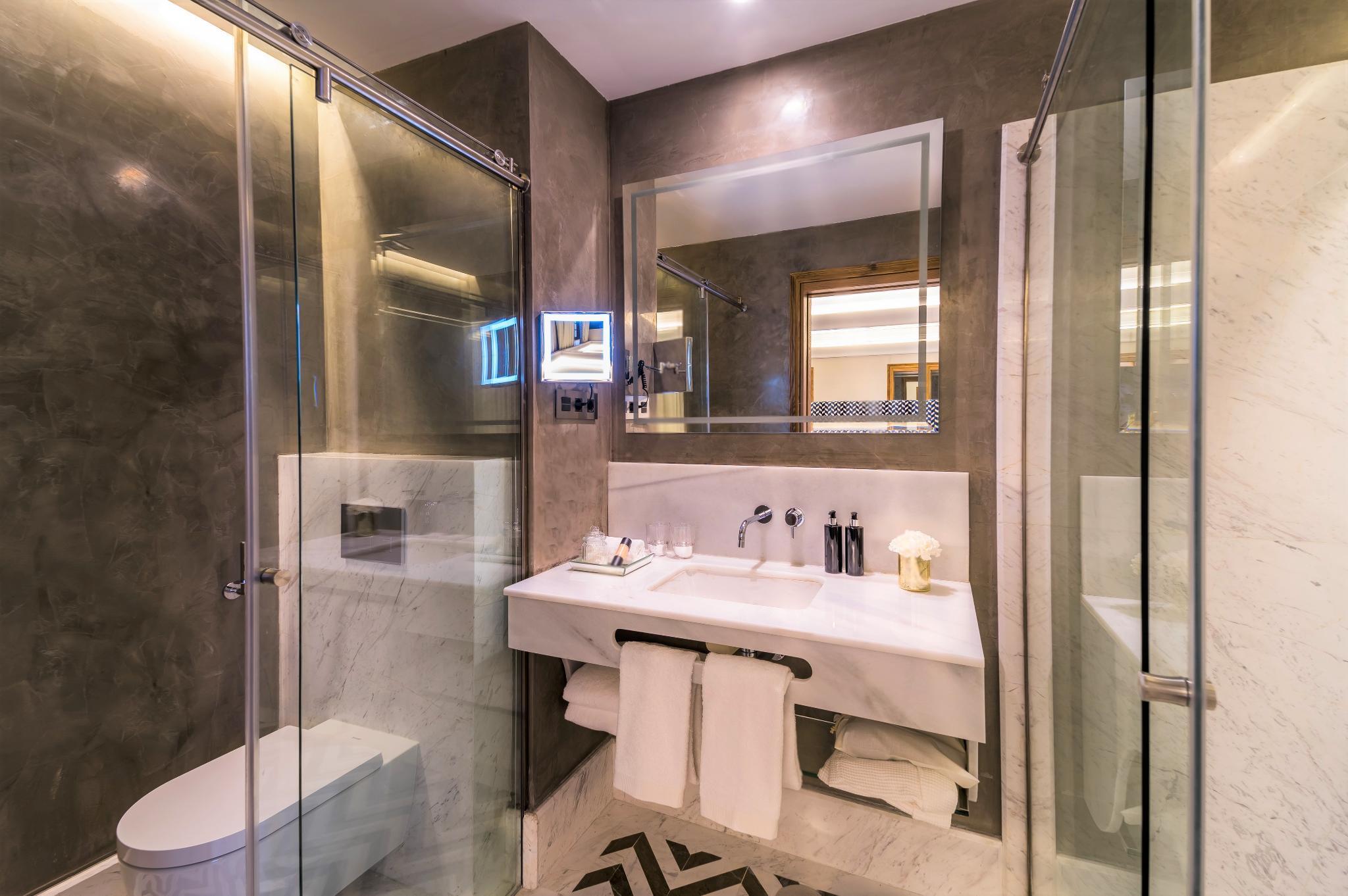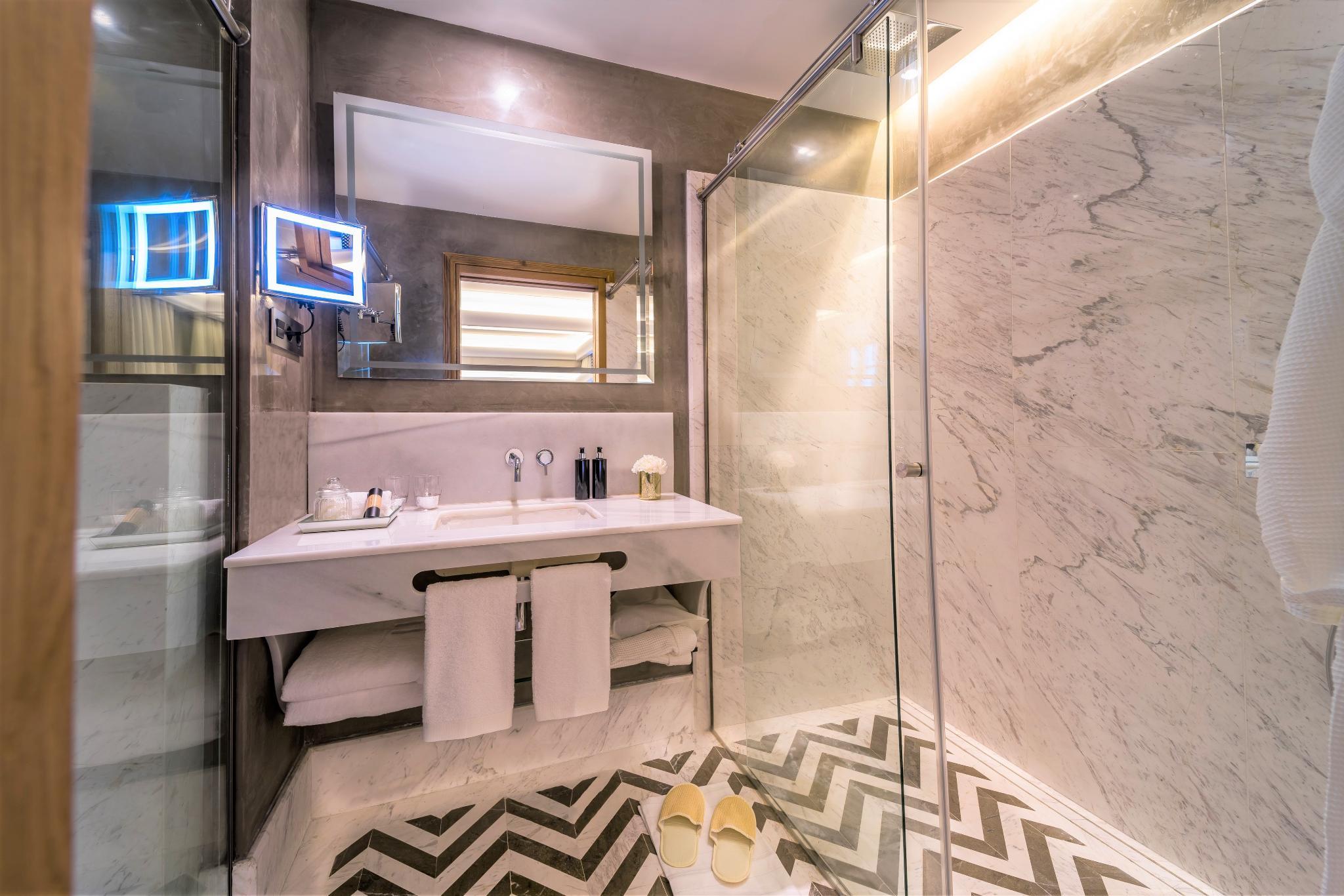 The rooms are bright and elegant with a great attention to detail to make your stay cosy and comfortable. The decoration takes inspiration from a traditional 18th-century Palace with a modern twist. All rooms feature a marble bathroom with a spacious shower - or bathtub and shower combination- , and a comfortable bed that invites you to rest after a long day exploring the city. Other services offered are air conditioning and heating, free WiFi, minibar, Nespresso coffee machine - in some rooms - , flat screen with international TV channels and safe.